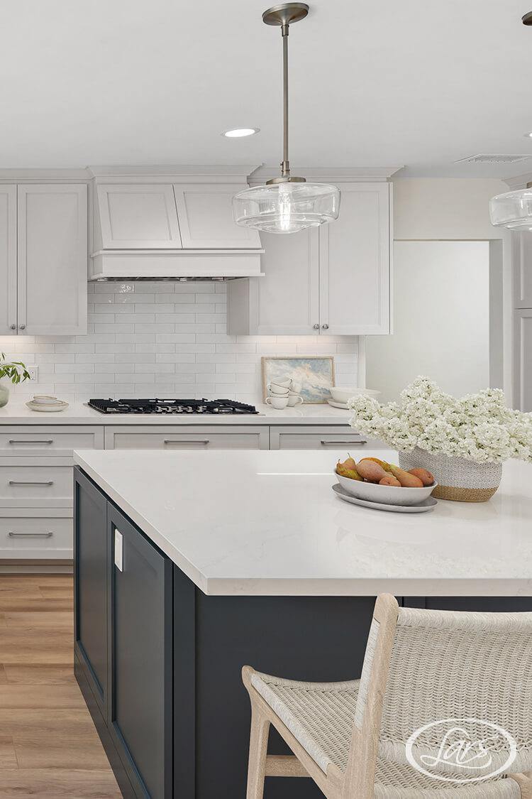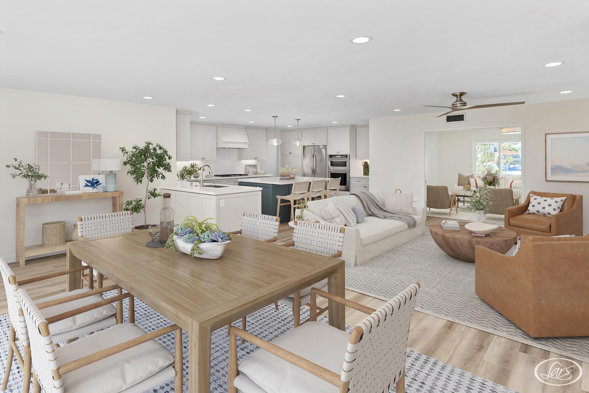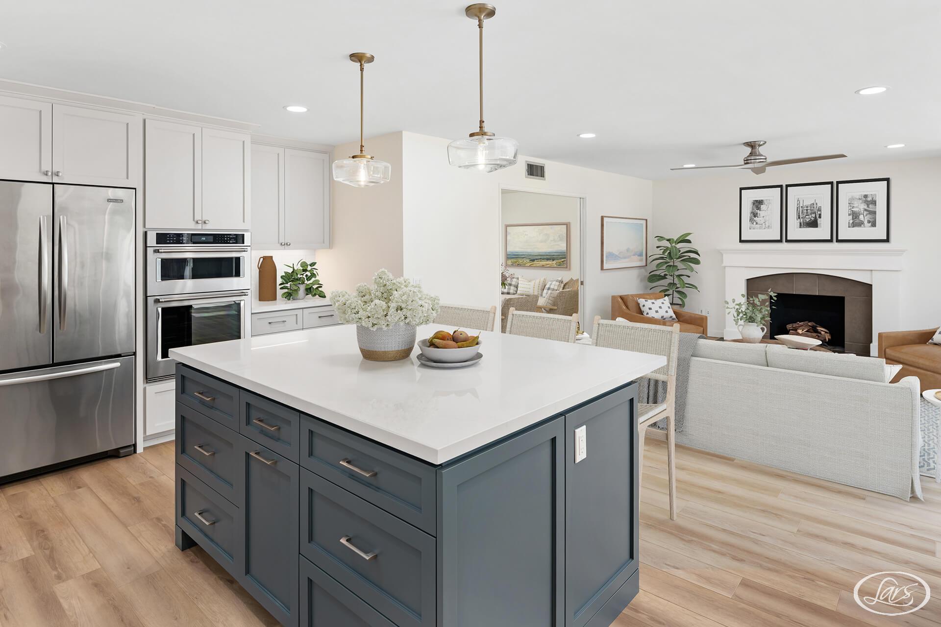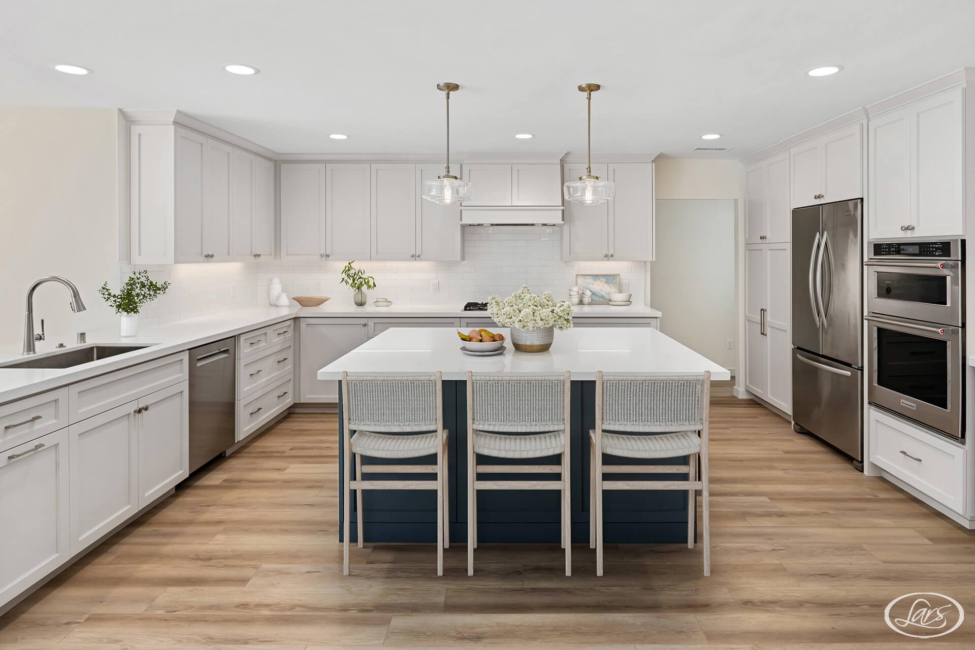 This open-concept remodel brings energy and elegance to a family-focused space. A striking blue kitchen island sets the tone for this bright transitional design, offering a vibrant focal point that anchors the room with style and purpose. Clean cabinetry, bright neutral tones, and luxury vinyl plank flooring create a seamless backdrop for both cooking and entertaining. In the living and dining areas, layered textures add warmth without overpowering the open layout. Thoughtful lighting, ample storage, and refined finishes make this home feel effortlessly balanced, transitional in style, and timeless in appeal.