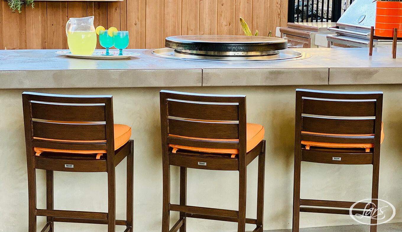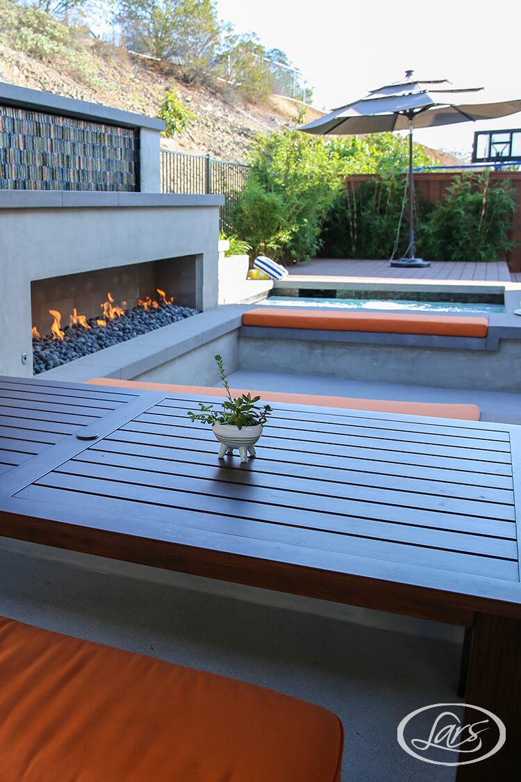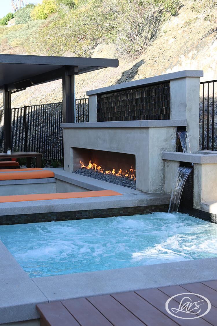 Designed for family fun and entertaining, this Rancho Penasquitos outdoor living space maximizes every inch of the backyard. The custom hot tub and deck offer a relaxing retreat, while the waterfall feature by the outdoor fireplace sets a tranquil ambiance for year-round enjoyment.