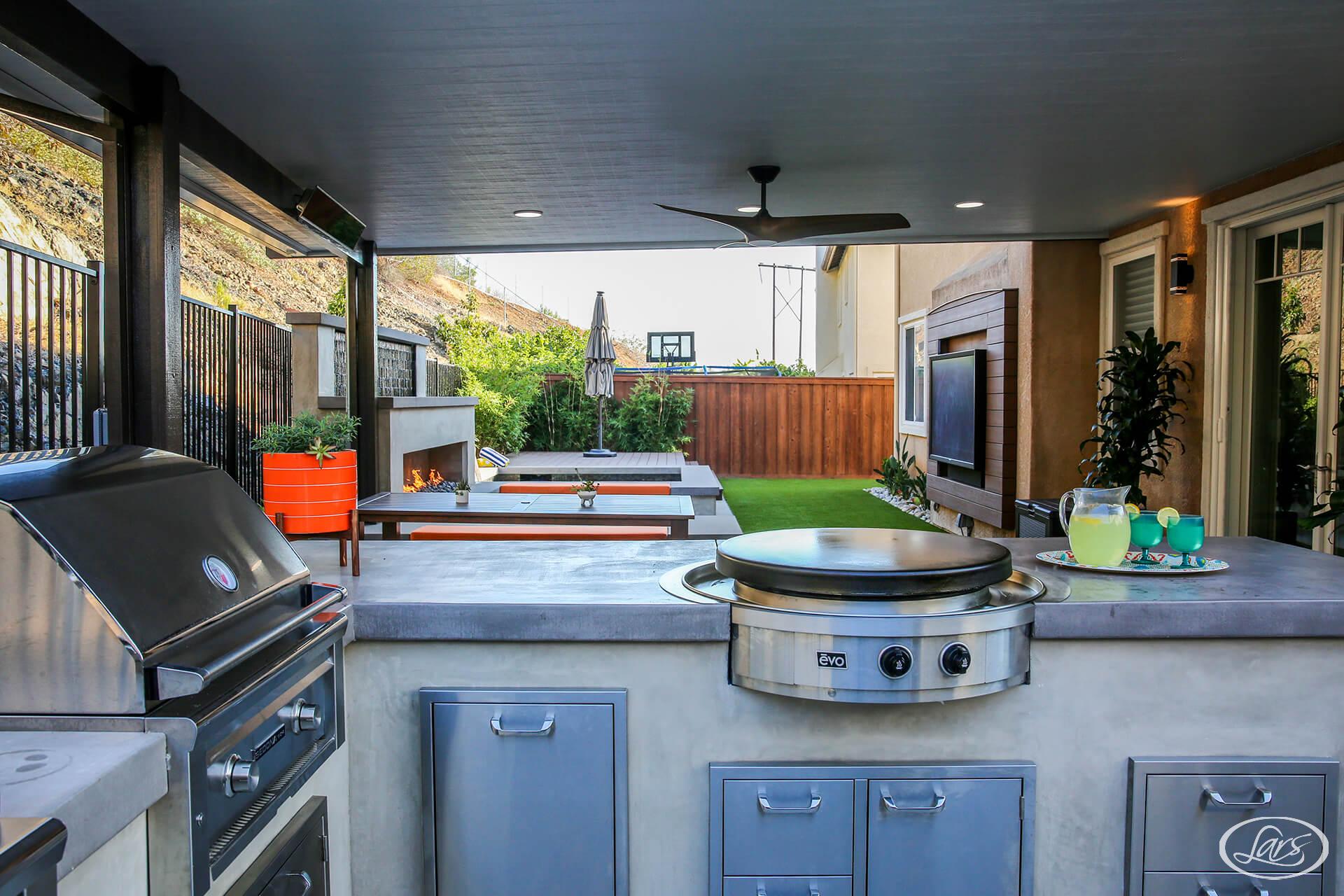 A spacious covered dining area flows into an outdoor kitchen, complete with a large island, Evo flat-top grill, Sedona grill, and a live herb garden which is perfect for al fresco entertaining. Plus, durable turf provides plenty of space for kids and pets to play.