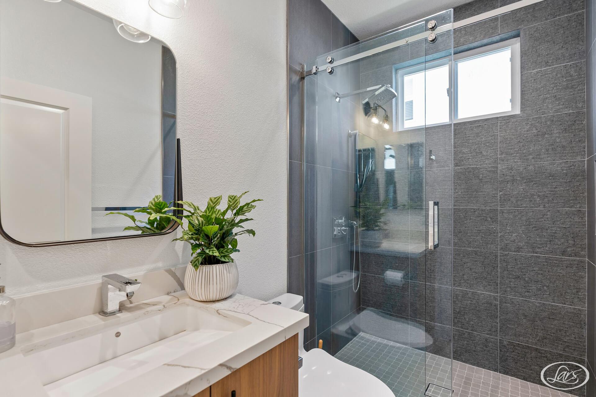 This San Diego whole home remodel blends transitional elegance with playful personality and bold detailing. The primary suite showcases custom vanities, warm wood tones, and polished brass finishes, while the Jack & Jill and guest bathrooms bring in vibrant cabinetry and curated tilework for added charm. Throughout the home, layered textures, hidden functionality, and thoughtful storage solutions elevate each space. From the inviting laundry room to the richly colored home office, every corner was designed to feel intentional, stylish, and distinctly livable.